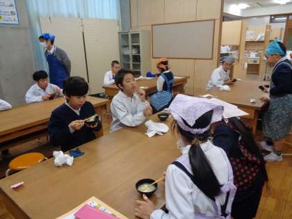 協力して作ったみそ汁を試食すると、みんな笑顔になりました。