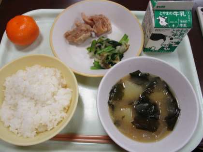 今日の献立は、ごはん、牛乳、鶏肉の唐揚げ、小松菜ひたし、じゃがいもの味噌汁、みかんです。みかんが美味しい季節になりました。