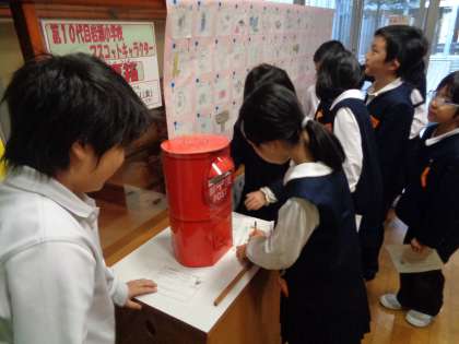 朝のぐんぐんタイムに、岩瀬っ子が応募したマスコットキャラクターを鑑賞し、お気に入りのキャラクターを探しました。どの作品もとても魅力的で、子供たちは悩みながら投票していました。
