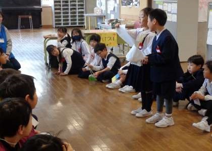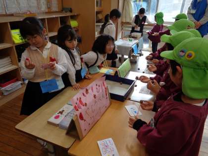 今日は、生活科「あきいっぱいまつり」に保育所の子供たちが来てくれました。初めての年下のお客さんに少し緊張した様子でしたが、張り切って頑張りました。