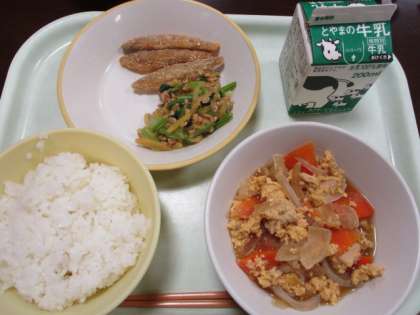 今日の献立は、ごはん、牛乳、きびなごの唐揚げ、納豆和え、親子煮です。