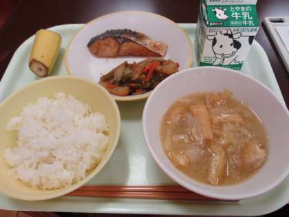 今日の献立は、ごはん、牛乳、ふくらぎの照り焼き、茎わかめのきんぴら、具だくさん汁、バナナです。