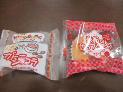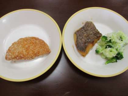 今日の給食は、選んで食べる献立です。選ぶおかずは、揚げ魚のレモン味とハムカツ。デザートは、イチゴのカップケーキとガトーショコラです。どちらも美味しそうです。