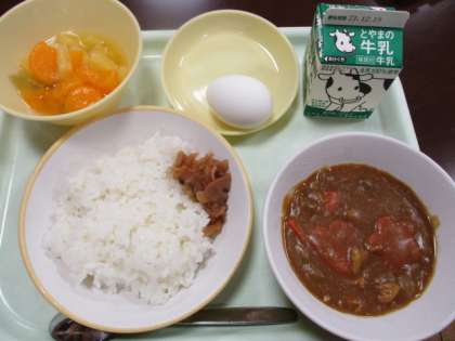 今日の献立は、ごはん、牛乳、カレーライス、ゆで卵、福神漬け、フルーツゼリーミックスです。カレーライスは子供たちの大好きな献立です。給食時間が始まる前から楽しみにしている子供たちがたくさんいました。カレーには可愛い形のにんじんが入っていました。