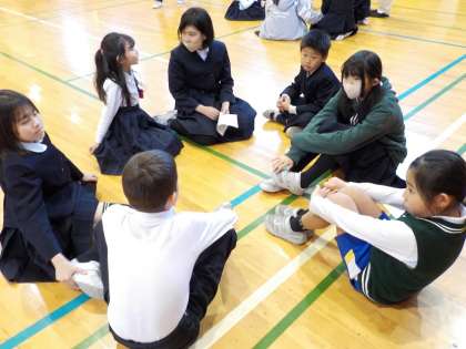 また、ファミリー班ごとに2学期のファミリー活動について聴き合いを行いました。清掃をがんばったことや異学年の友達と仲良くなったことなど、すてきな意見がたくさん出されました。