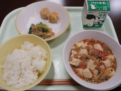 今日の献立は、ごはん、牛乳、にんじんシューマイ、大根ナムル、マーボー豆腐です。中華料理がとても美味しかったです。