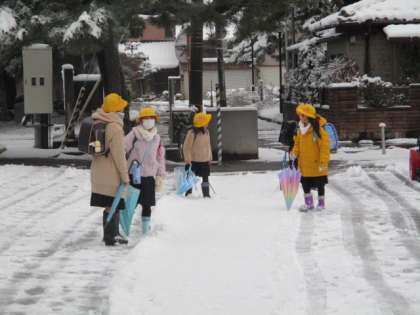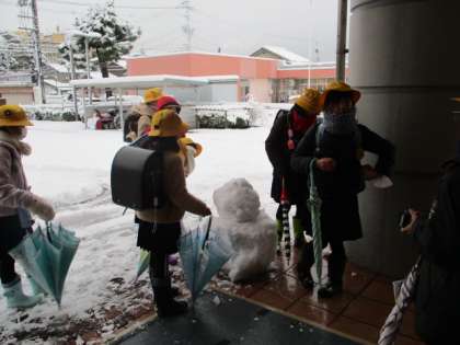 おはようございます。昨日からの雪が積もり、今日も一日雪の予報となっています。時折吹雪く中、子供たちは元気に登校してきました。降り積もった雪や玄関前の雪だるまに大喜びの子供たちです。