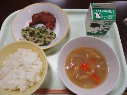 今日の献立は、ごはん、牛乳、豚肉のかおり揚げ、梅肉和え、みそ汁です。温かい味噌汁が美味しいです。
