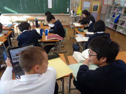 3学期の学習が始まりました。今週の国語の学習では詩の学習を進め、お気に入りの詩を図書コーナーから見つけて試写しました。教室前には、様々な詩が並んでいます。