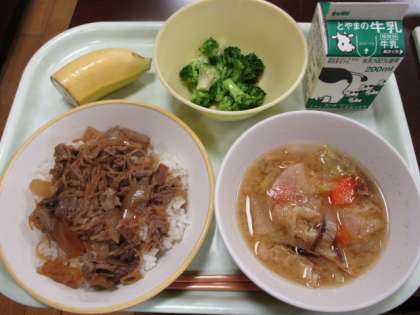 麦ご飯、牛乳、パワーぎゅうぎゅう丼、ゆでブロッコリー、具だくさん汁、バナナです。美味しく食べて、筋力アップを目指しましょう。