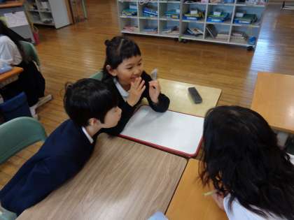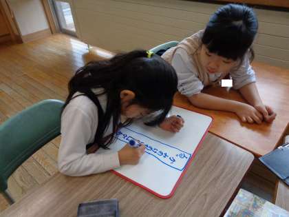 「かばんの中には、かばがいる。」のように、言葉を見つける学習をしました。たくさん見つけた後には、班ごとに問題をつくってクイズ大会をしました。