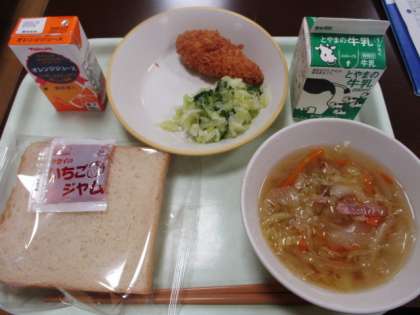今日の献立は、食パン、牛乳、ささみフライ、野菜のドレッシング和え、白菜スープ、いちごジャム、オレンジジュースです。