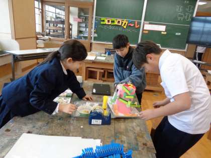 図画工作科の学習でコロコロガーレをしました。コースでビー玉を転がしたり、コースを作ったりと楽しそうに活動していました。