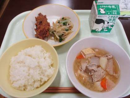 今日の献立は、ごはん、牛乳、魚のりきゅう揚げ、もやしのおひたし、豚汁です。豚汁は生姜の味がきいていて、体が温まりました。