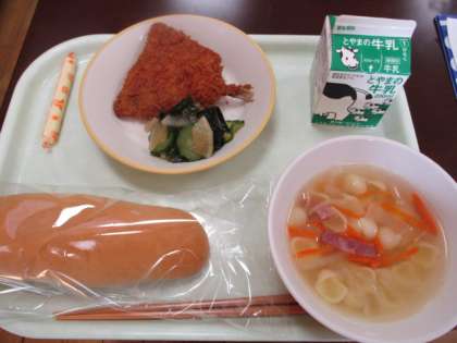 今日の献立は、コッペパン、牛乳、あじフライ、大根サラダ、マカロニスープ、棒チーズです。