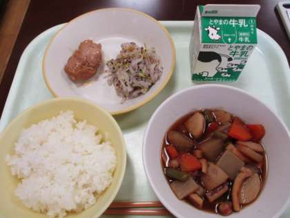 今日の献立は、ご飯、牛乳、照り焼きチキン、ゆかり和え、里芋といかの煮物です。
