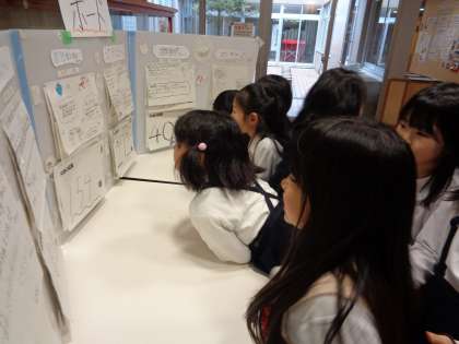 「なわとびボード」に書いてある、6年生からのメッセージを見た1年生は、手紙でありがとうを伝えることにし、届けに行きました。6年生の笑顔を見て、1年生も嬉しそうでした。
