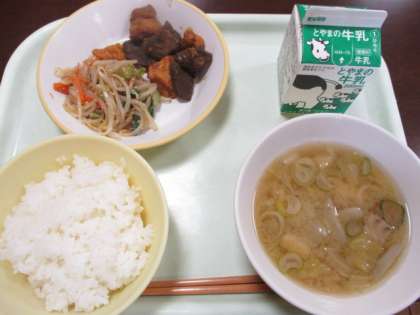 今日の献立は、ごはん、牛乳、鶏肉とレバーのカレー風味、ナムル、たら汁です。