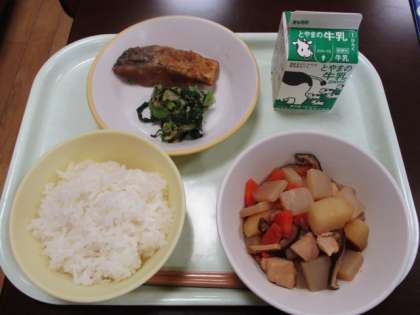 今日の献立は、ごはん、牛乳、揚げ魚のレモン味、磯和え、大和煮です。揚げ魚のレモン味は、酸味のあるタレがかかっていて、とても美味しかったです。