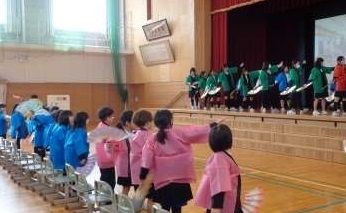 1年生は創校記念日の歌を歌ったり、まだら踊りを踊ったりと、真剣に参加していました。