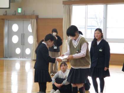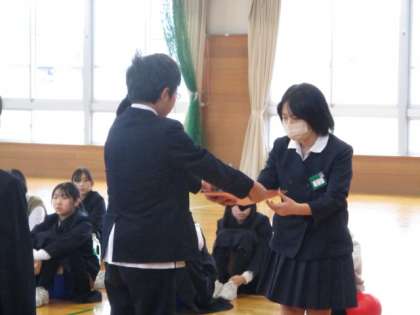 児童会引き継ぎ式を行いました。卒業を間近に控えた6年生から、次のリーダーの5年生へ各委員会のファイル等の引き継ぎをしました。6年生の言葉を受けて、5年生はリーダーとしてよりよい学校にしていこうという気持ちを高めていました。6年生さん、一年間学校のリーダーとしてがんばってくれてありがとう。