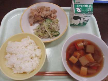 今日の献立は、ごはん、牛乳、豚肉の生姜焼き、ゆかり和え、けんちん汁です。