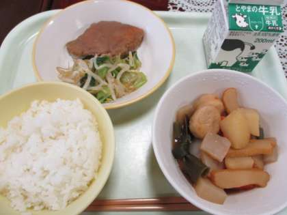 今日の献立は、ごはん、牛乳、魚の甘味噌かけ、おひたし、関東炊きです。