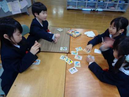 同じ班の友達とカルタ遊びをしました。 自分たちでルールを確認しながら、仲良く楽しみました。