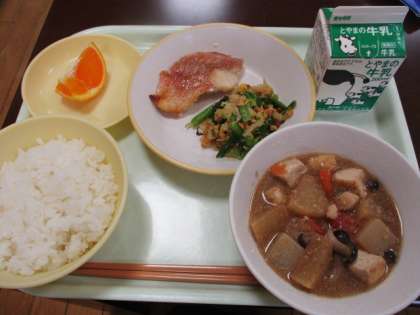 今日の献立は、ごはん、牛乳、赤魚の塩焼き、いり大豆和え、根菜のごま煮、清見オレンジです。