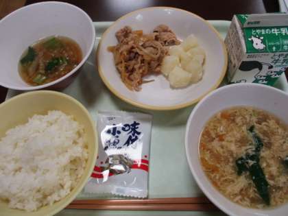 今日の献立は、ご飯、牛乳、豚肉のキムチ炒め、粉ふきいも、中華かき玉汁、味付け小魚です。一年間、美味しい給食を食べて成長した子供たちです。