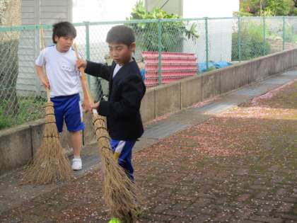3年生の児童が散ってしまった桜の花びらを掃除してくれました。進んで活動している3年生です。