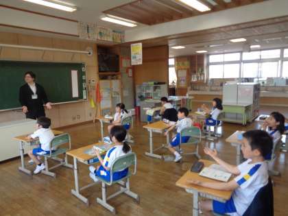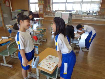 外国語活動の学習が始まりました。ALTと楽しく学習をしています。英語で自己紹介をしあいました。