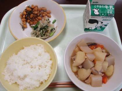 今日の献立は、ごはん、牛乳、小魚いりフライビーンズ、しょうがひたし、南蛮煮です。美味しい給食で、体も心も温かくなりました。