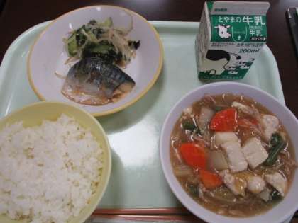 今日の献立は、ご飯、牛乳、さばの味噌煮、ごま酢和え、豆腐と野菜のうま煮です。豆腐と野菜のうま煮には、たくさんの野菜が入っていました。