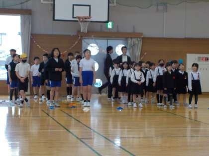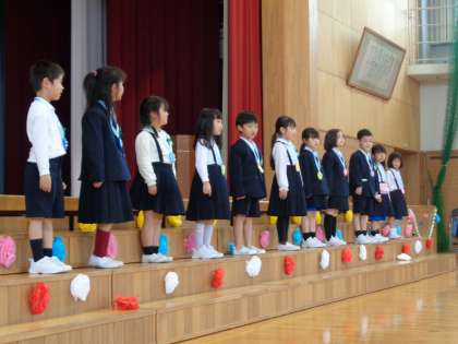 1年生はお礼に校歌を歌いました。とっても元気よく歌えました。出し物の後は、全校で歌を歌いました。