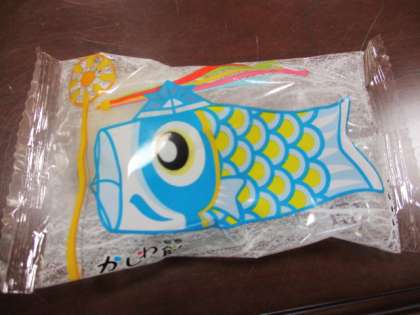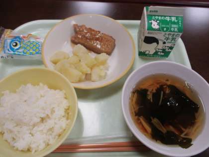 ごはん、牛乳、こいのぼりハンバーグ、こふきいも、若竹汁、かしわもちです。