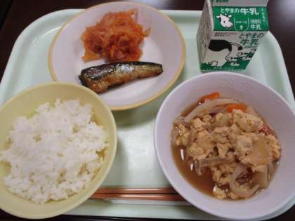 朝から雨が降り、肌寒い一日です。今日の献立は、ご飯、牛乳、いわしの生姜味、切り干し大根のケチャップ炒め、卵とじです。