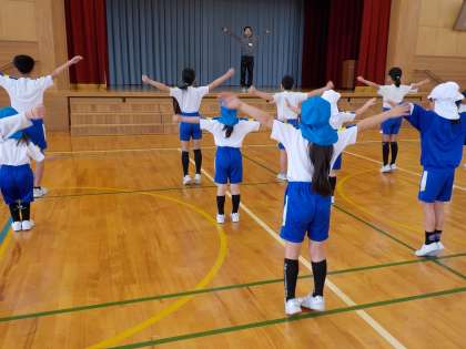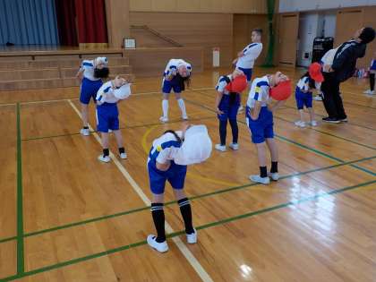 今日は、あいにくの雨模様でした。大休憩の時間はグラウンドに出ることができなかったので、体育館でラジオ体操を行いました。手の伸ばし方やひざの曲げ方等を意識しながら体操しました。運動会に向けて、これから各教室でも練習します。