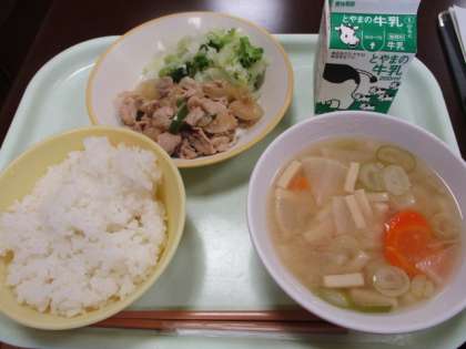 今日の献立は、ご飯、牛乳、焼き肉、添え野菜、味噌汁です。焼き肉はにんにく風味で美味しかったです。味噌汁には可愛いハート型のにんじんが入っていました。調理員さんの愛情たっぷりの給食です。