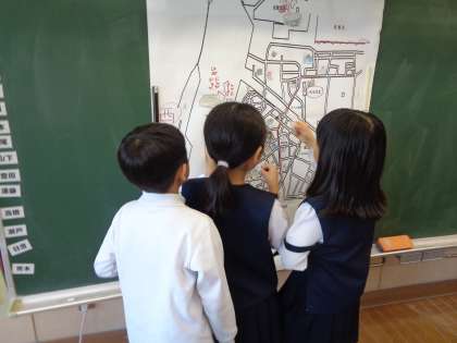 社会科「絵地図づくり」 5月9日(木) 3年生 公開日 2024/05/09 更新日 2024/05/09 3年生 学校のまわりの絵地図づくりをしています。寺や神社、工場等の絵をかき、地図にはりました。