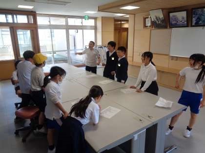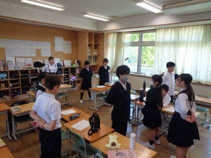 6年生が5年生に、応援パフォーマンスの内容を伝えました。さっそく声出しを行う団もありました。