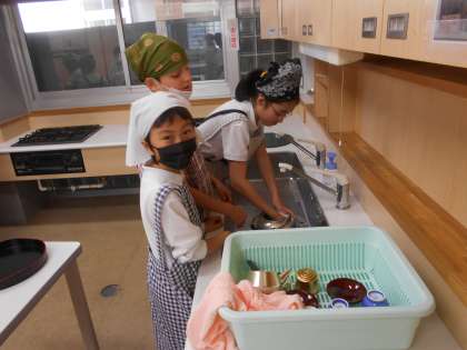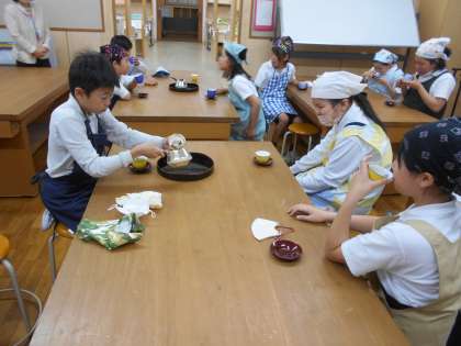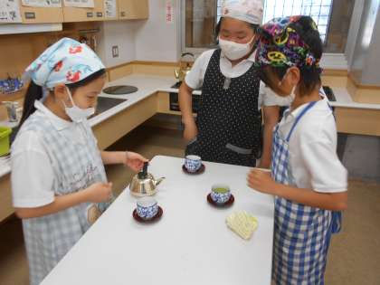 家庭科の学習で、班で協力し、お湯を沸かして、お茶をいれました。準備から片付けまで力を合わせて取り組んでいました。