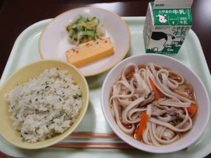 今日の献立は、菜めし、牛乳、千草焼き、おひたし、かやくうどんです。給食のうどんは具だくさんでおいしいです。