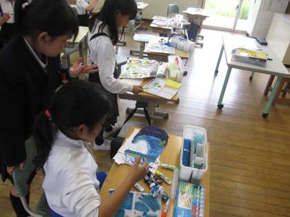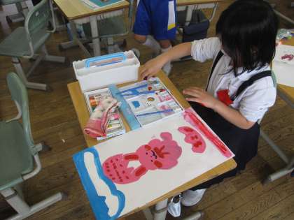 図工の作品で、たまごから何が生まれるか想像してかきました。塗ったり、切ったり、貼ったりと工夫を凝らして作品を作っています。