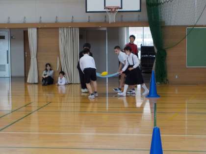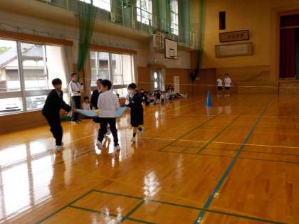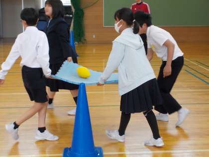 ファミリー旗の打合せ後、運動会のファミリー班競技について確認しました。班の4人でマットを持ち、上に置いたボールを運びます。まずは、6年生でデモンストレーションを行いました。