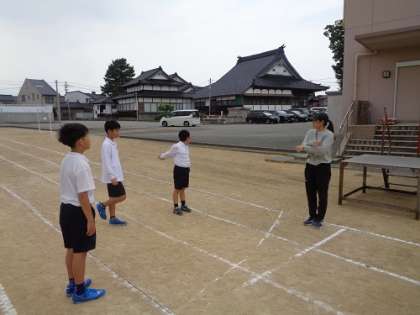 運動会のラジオ体操で前に立って行う役を任された運動・安全委員会の子供たちが、朝活動の時間を利用して、先生とともに練習を行っていました。