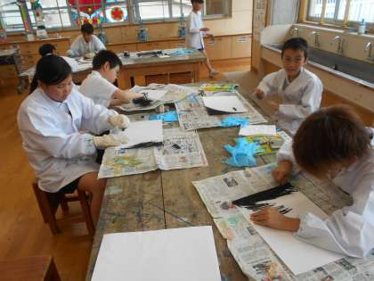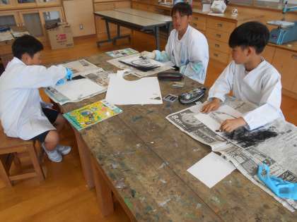 図画工作科の学習で、コンテで黒く塗りつぶした紙を消しゴムで消して作品を作りました。