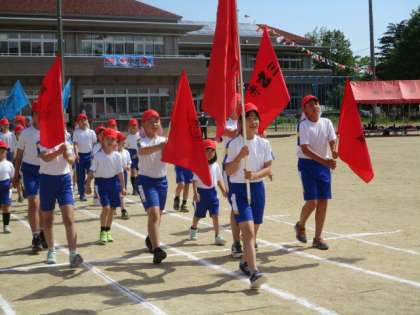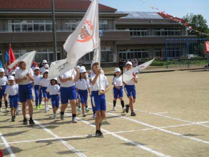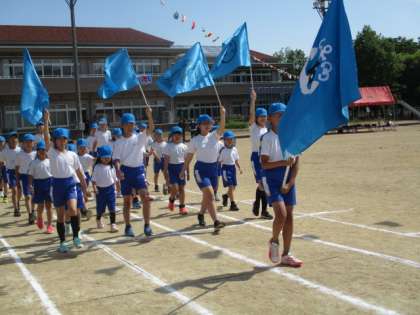 入場行進の様子です。今年はファミリー班の旗をつくって仲間とのつながりを大切にし、運動会への気持ちを高めました。
