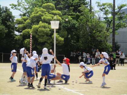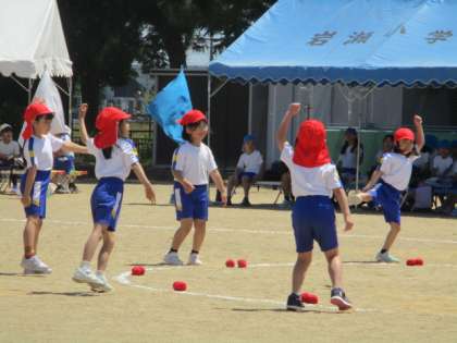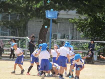 1、2年生の「ジャンボリー玉入れ」です。ダンスが可愛らしくてとても上手でした。かごの中に玉を入れようと、一生懸命に投げました。
