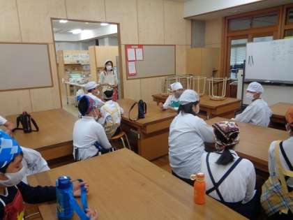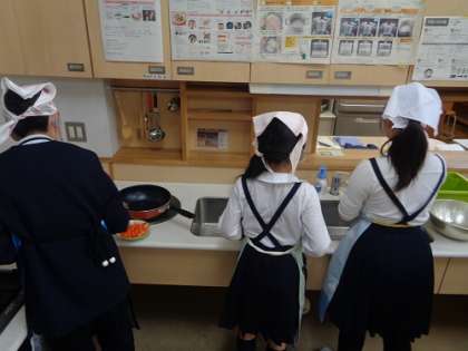 五つのグループに分かれて調理実習を行いました。みんなで野菜炒めをつくりました。